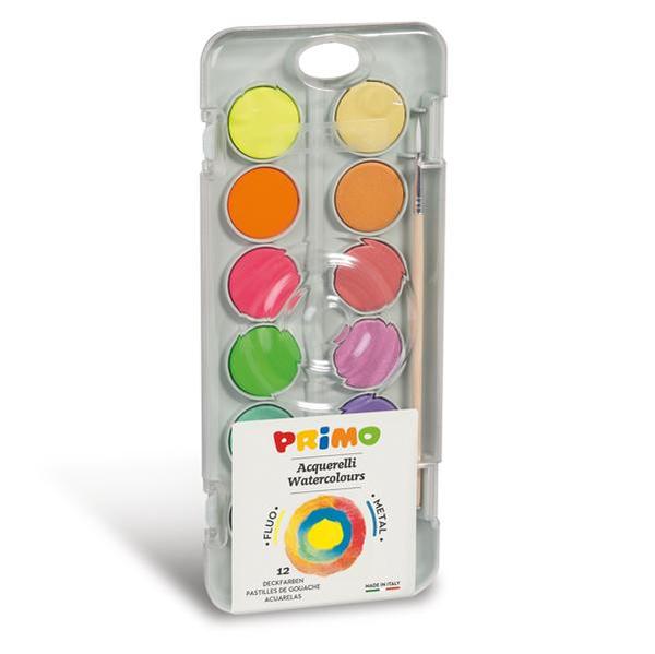 Pastiglie acquerello fluo e metallizzato ottenute comprimendo polveri ad alto contenuto di pigmento, di qualita' speciale, in scatola in plastica da 12 colori, con pratico coperchio tavolozza e pennello. Diluite con poca acqua permettono di ottenere stesure coprenti e brillanti. Utilizzabile per la tecnica classica su fogli di carta o cartoncino da acquerello e per tecniche particolari anche su supporti diversi. Compatibile con gli altri prodotti ad acqua delle linee Morocolor.