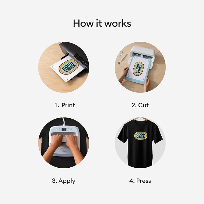 Realizzare progetti a colori che prevedono il trasferimento termico è più facile che mai con questo incredibile materiale termoadesivo. Niente più complesse sovrapposizioni di diversi fogli di termovinile: grazie alla pellicola protettiva al posto del supporto, potrai stampare le tue grafiche preferite direttamente sul termovinile, proprio come se fosse carta adesiva! Ti basterà progettare la tua grafica, stamparla a colori con una comune stampante a getto d'inchiostro e caricarla nella tua macchina Cricut, che eseguirà un taglio ad altissima precisione. Per finire, dovrai soltanto trasferire il progetto su una t-shirt, una borsa di tela, un elemento decorativo o molto altro ancora con una termopressa Cricut o un semplice ferro da stiro. Istruzioni importanti Applica solo su materiali prelavati e completamente asciutti Aspetta 48 ore dopo l'applicazione prima di lavare Lava a rovescio in acqua fredda, appendi e lascia asciugare Non candeggiare Stira solo sulla parte posteriore del capo Non stirare la decorazione