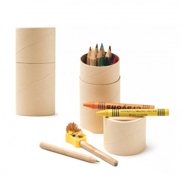 Set da disegno da 13 pezzi. 6 pastelli, 6 matite di legno e un temperino incluso. Confezione in astuccio di cartone. Dimensioni: cm 10x4,6Ø